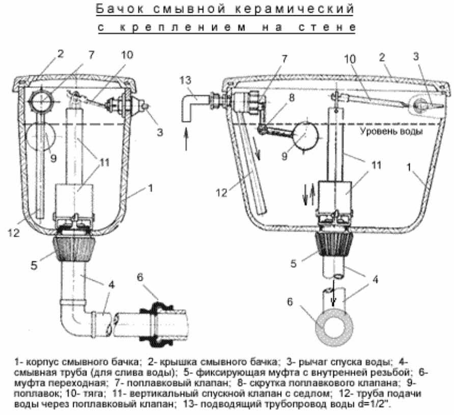 Прежде, чем приступить к устранению неполадки, следует ознакомиться со строением системы слива, которая, в свою очередь, зависит от конструкции бачка унитаза