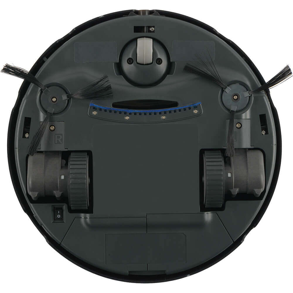 Если перевернуть робот-пылесос вверх дном, то можно увидеть две боковые щетки, небольшое всасывающее отверстие, 2 ведущих колеса и ролик. Там же расположены датчики перепадов высоты и ориентации в пространстве. Кнопка выключения аналогично большинству других моделей расположена снизу.