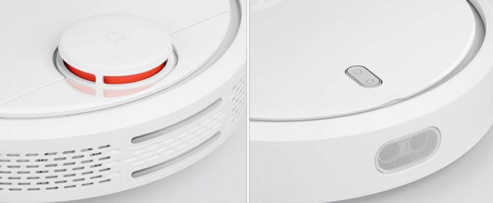 На верхней поверхности устройства есть сдвоенная кнопка и небольшое круглое возвышение. В нём находится лазерный дальномер, который сканирует окружающую обстановку для построения карты помещения. По бокам расположены два датчика, которые определяют расстояние до стен. В задней части пылесоса находятся две металлических полоски, необходимых для контакта с зарядным устройством.