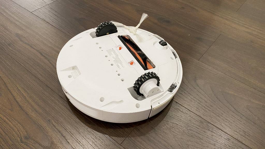 Снизу расположена ходовая часть, состоящая из двух больших колёс с резиновыми зубцами для надёжного сцепления с поверхностью пола и одного небольшого поворотного колёсика спереди. Здесь же расположены датчики высоты, которые оберегают устройство от падения. В центре видна яркая оранжевая щётка для сбора мусора, а немного в стороне — боковая крутящаяся щёточка для очистки углов и стыков.
