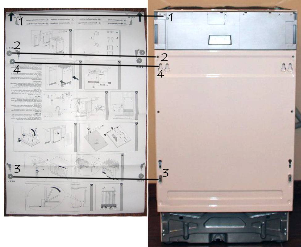 После подключения к электросети и коммуникациям, посудомоечная машина устанавливается по уровню посредством регулировки высоты ножек. Прежде чем встраивать ее в мебельный гарнитур, необходимо произвести пробный запуск без посуды, но с моющим средством