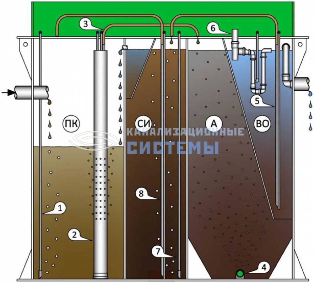 Сточные воды поступают в камеру ПК, там происходит их измельчение, насыщение воздухом аэратором 1 и начинается процесс переработки. С помощью аэрлифта 3 сточные воды перекачиваются в камеру А, где продолжается аэрация аэратором 4, выполняется доочистка и отстаивание ила в камере ВО. Очищенная на 97 — 98% вода из камеры ВО отводится из станции, а переработанный ил, при помощи аэрлифта 5 перекачивается в камеру СИ откуда, каждые 3 — 6 месяцев происходит откачка мертвого ила при обслуживании станции.