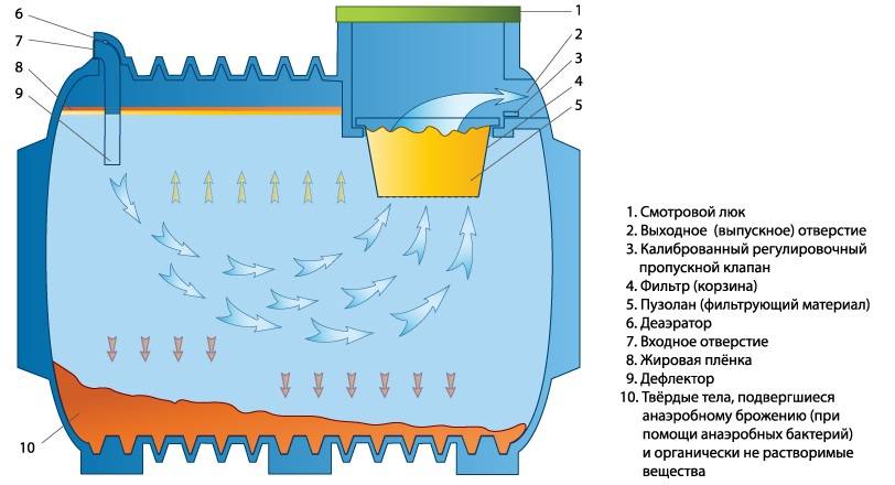 Септик Тритон разделен на два или три отсека — в зависимости от модели. Первый — самый большой — накопитель. В него через входной патрубок поступают стоки из дома. В нем органика сбраживается, понемногу разлагается бактериями, которые живут в отходах. При этом твердые составляющие начинают разлагаться/распадаться, оседают на дно. Также выделяются частицы, содержащие жиры. Так как они легче воды, они поднимаются на поднимаются на поверхность, образуя там пленку/корку, которая создает идеальные условия для жизнедеятельности бактерий.