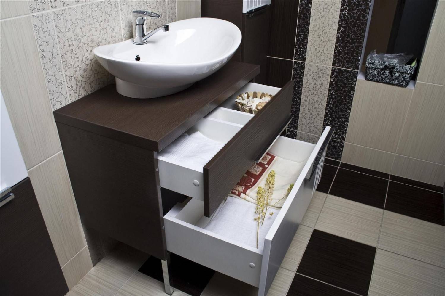 Удобны для использования чаши, встроенные в столешницу. Столешница, в свою очередь, также закрепляется на стене, а не устанавливается на пол. Таким образом, зона под раковиной остается полностью свободной, что удобно для уборки и просто для умывания. Однако более практичные жильцы устанавливают под раковину-столешницу или малогабаритную стиральную машинку, или небольшую этажерку для санитарных аксессуаров.