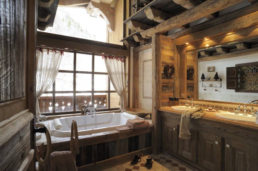 На фото пример обустройства ванной комнаты в стиле альпийского шале